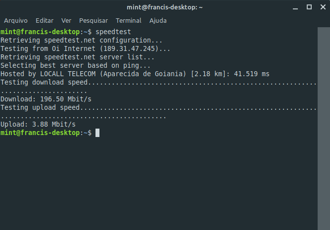 Tenho aqui internet vivo fibra no meu desktop com Linux mint mate 19.1 , minha internet é de 300mega e upload 150 mega, quando faço o teste pelo site do speedtest ta tudo certo, mas quando faço via terminal só o download é que confere com a realidade o upload sempre fica em 4 , alguem ai com o mesmo problema?